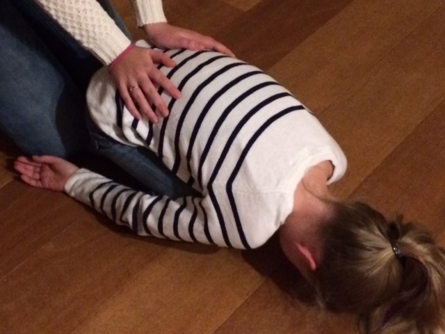 Deze oefening duurt maar een paar minuutjes en laat jullie samen weer tot rust komen. Je zoon/dochter gaat op de knieën op de grond zitten en buigt voorover. Deze houding zorgt al voor een veilig gevoel. Ga nu zelf achter haar zitten en leg je handen op de onderrug. Allebei rustig ademhalen.