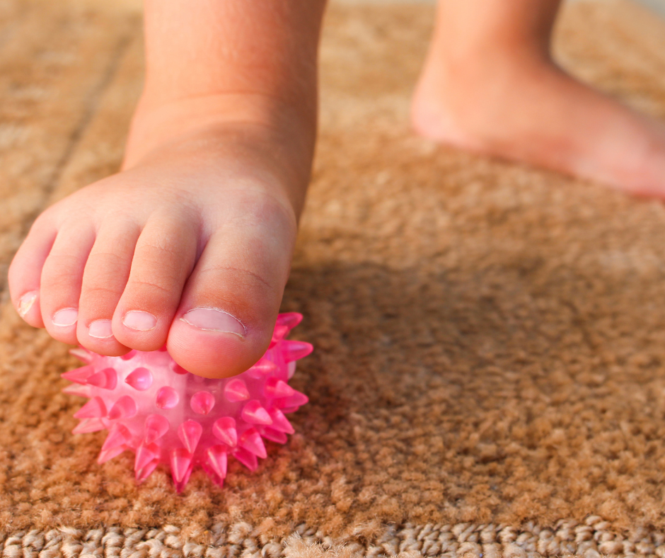 Leg een klein balletje onder je voet. Rol het balletje onder je voet; bij je tenen, het midden van je voet, je hiel, dan onder je hele voet door blijven rollen. Vergeet niet de binnenkant en de zijkant van je voet. Als laatste laat je het nog even rollen daar waar het, het prettigst voelt. Zet dan je voeten naast elkaar. Voel goed allebei je voeten op de grond en voel hoe ze aanvoelen. Allebei hetzelfde of verschillend? Doe nu hetzelfde met je andere voet. En voel vervolgens weer allebei de voeten op de grond. Blijf nog even staan met je voeten stevig op de grond en adem een paar keer rustig in en uit. Als het voor je zoon of dochter heel moeilijk is om het evenwicht te bewaren, laat ze zich dan met 1 hand vasthouden. (Je hoeft hiervoor geen speciaal balletje te hebben, ieder klein balletje is geschikt.)